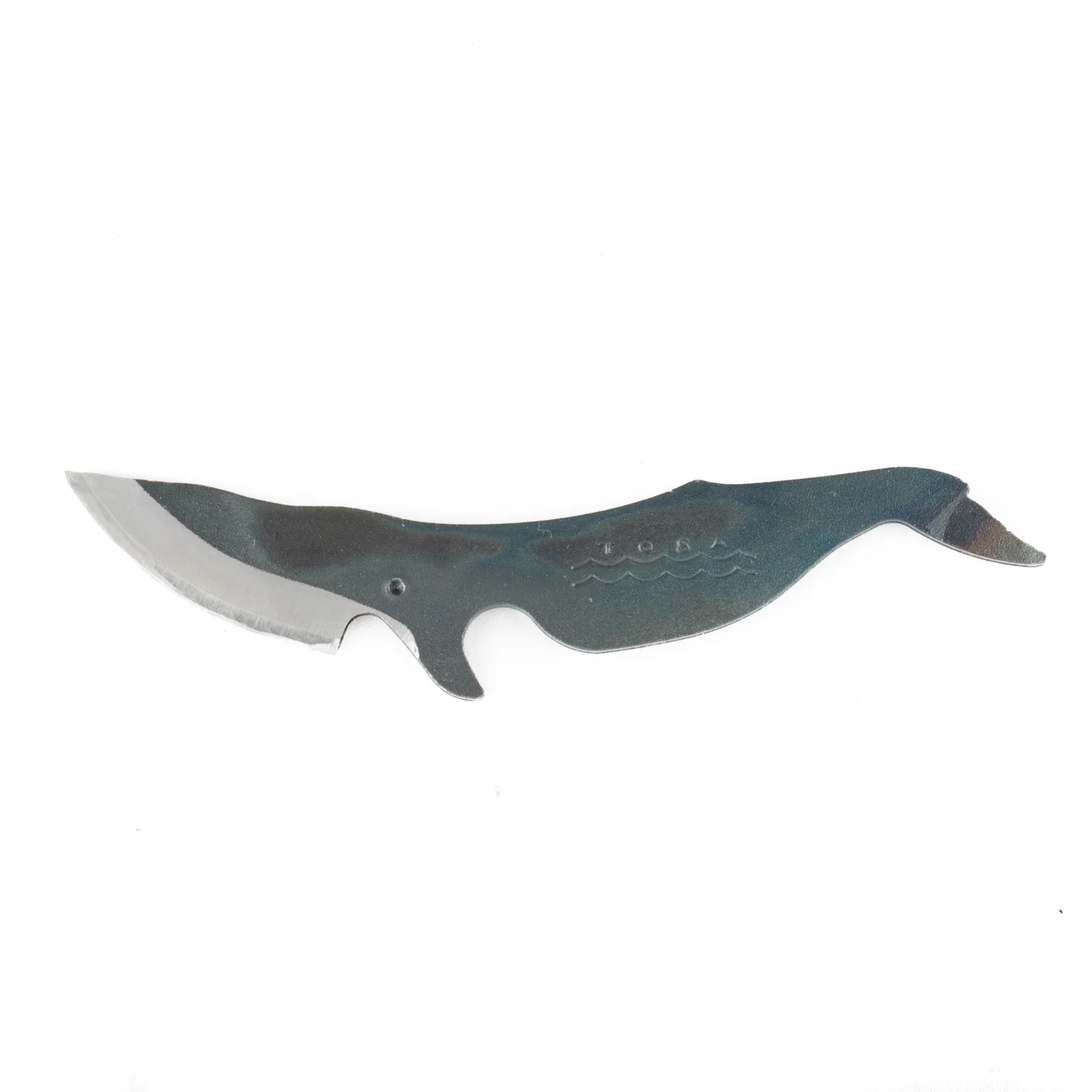 Despite its delightful whale design, this is nevertheless a real knife. Originally commissioned by a mother who was looking for a knife without a sharp tip for her child to use to sharpen pencils, the gentle curves of this knife are pleasing to the eye, and it fits perfectly in hands of any size. Two kinds of metal ore are used in combination in the making of this knife, and great attention is given to the hardening and oil-tempering stages of the forging process in order to achieve exceptional sharpness.